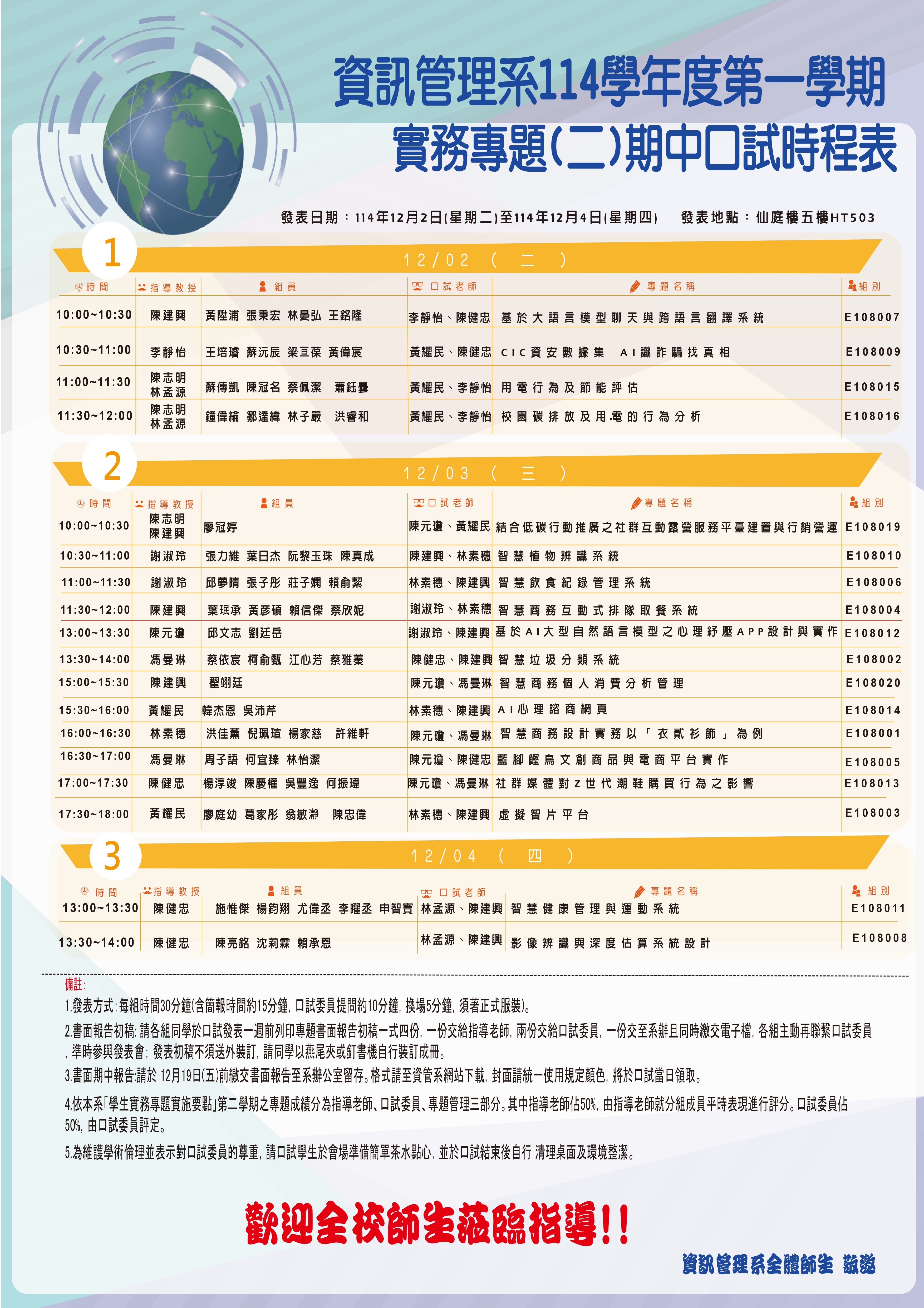 【公告】114學年度第一學期實務專題(二)期中口試時程
