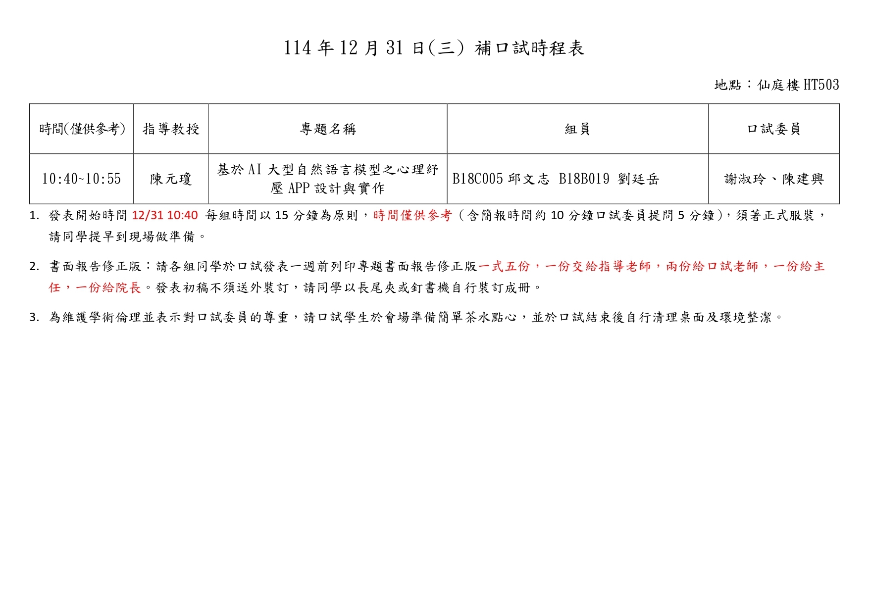 【更新公告】114學年度第一學期實務專題(二)補口試時程